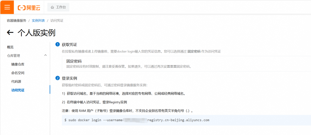 在访问凭证中设置固定密码,记住密码、用户名、仓库地址、命名空间这四个参数。