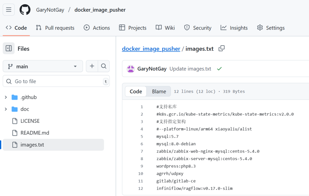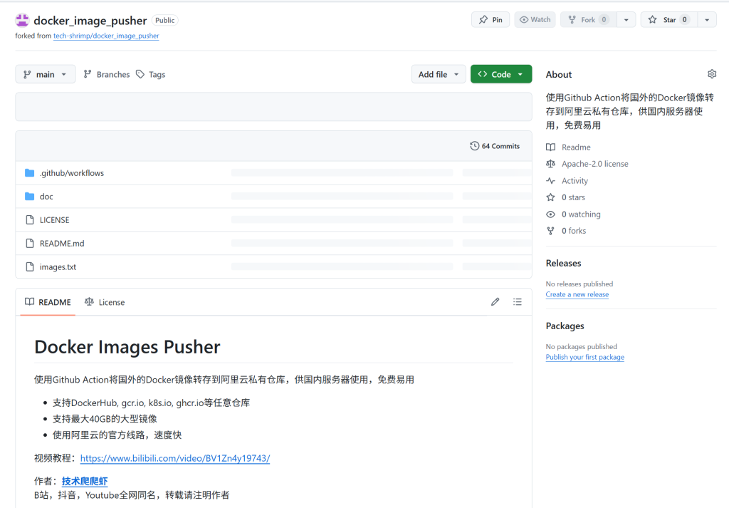 在github上打开docker_image_pusher项目,地址:https://github.com/tech-shrimp/docker_image_pusher,将其fork到自己仓库。
