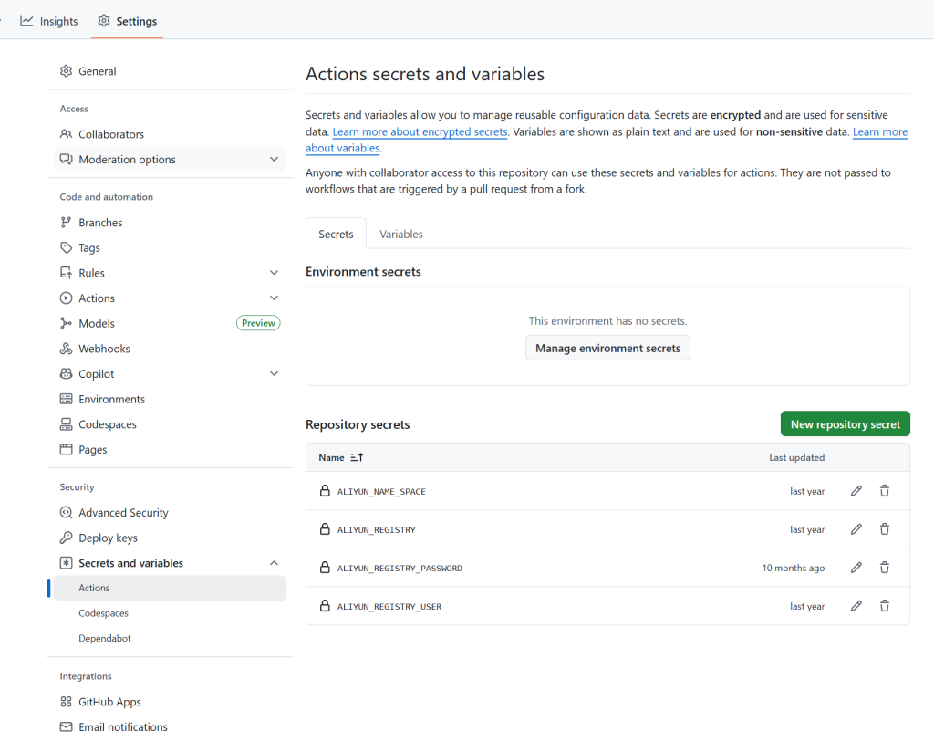 进入Settings(Actions同一行最右侧),选择Secrets and variables -> Actions,点击New repository secret,分别创建四个环境变量。